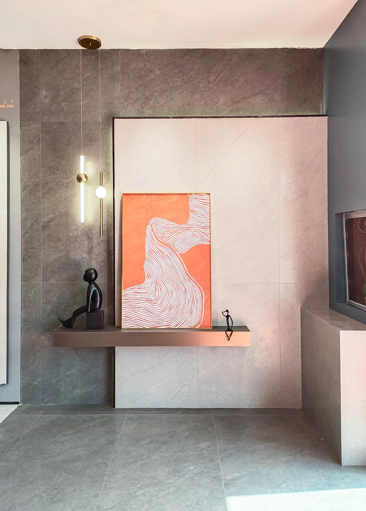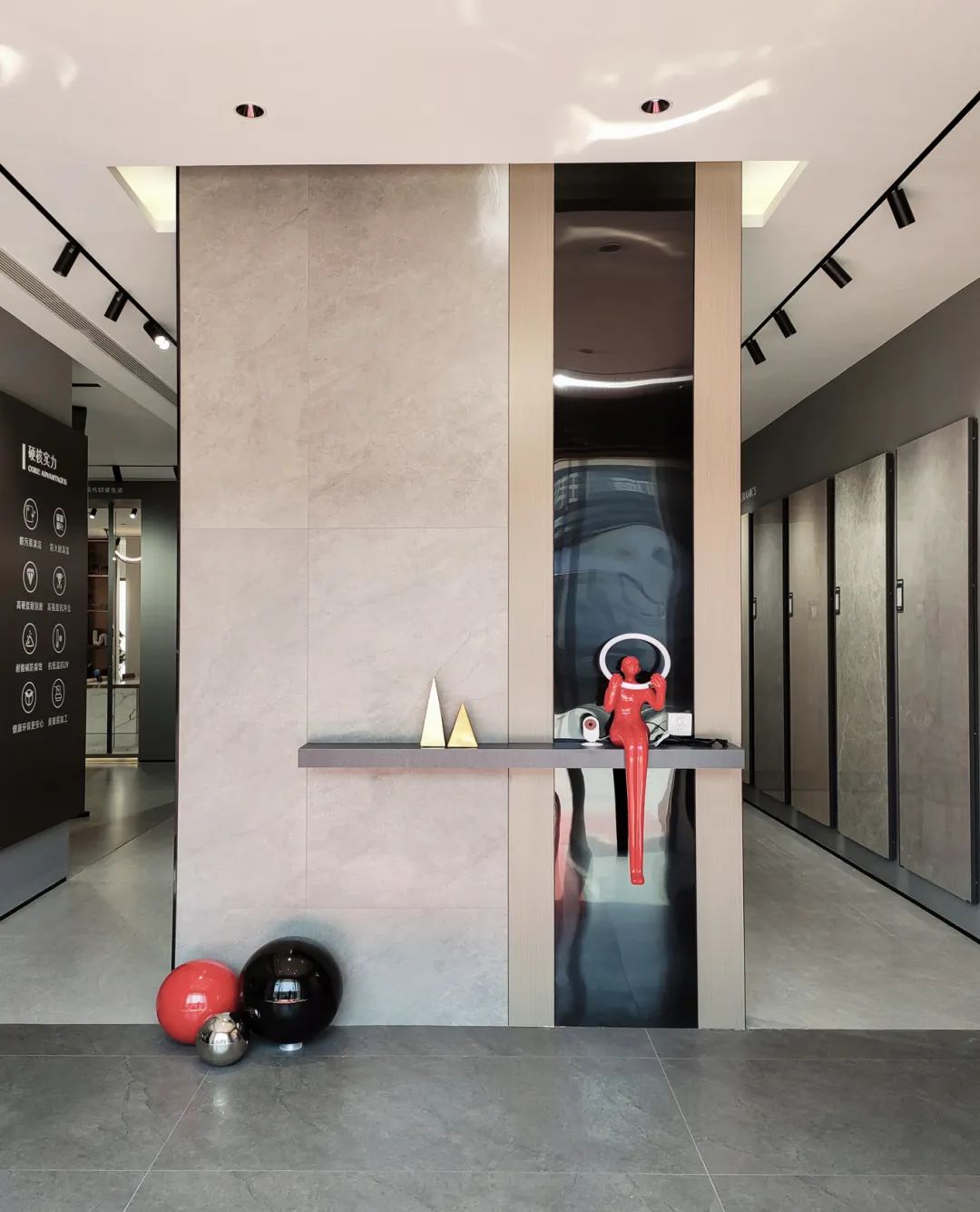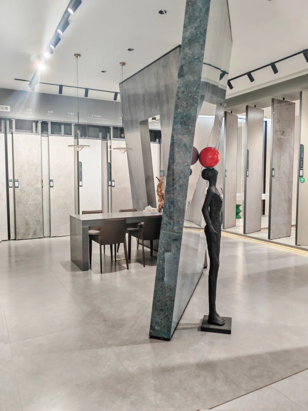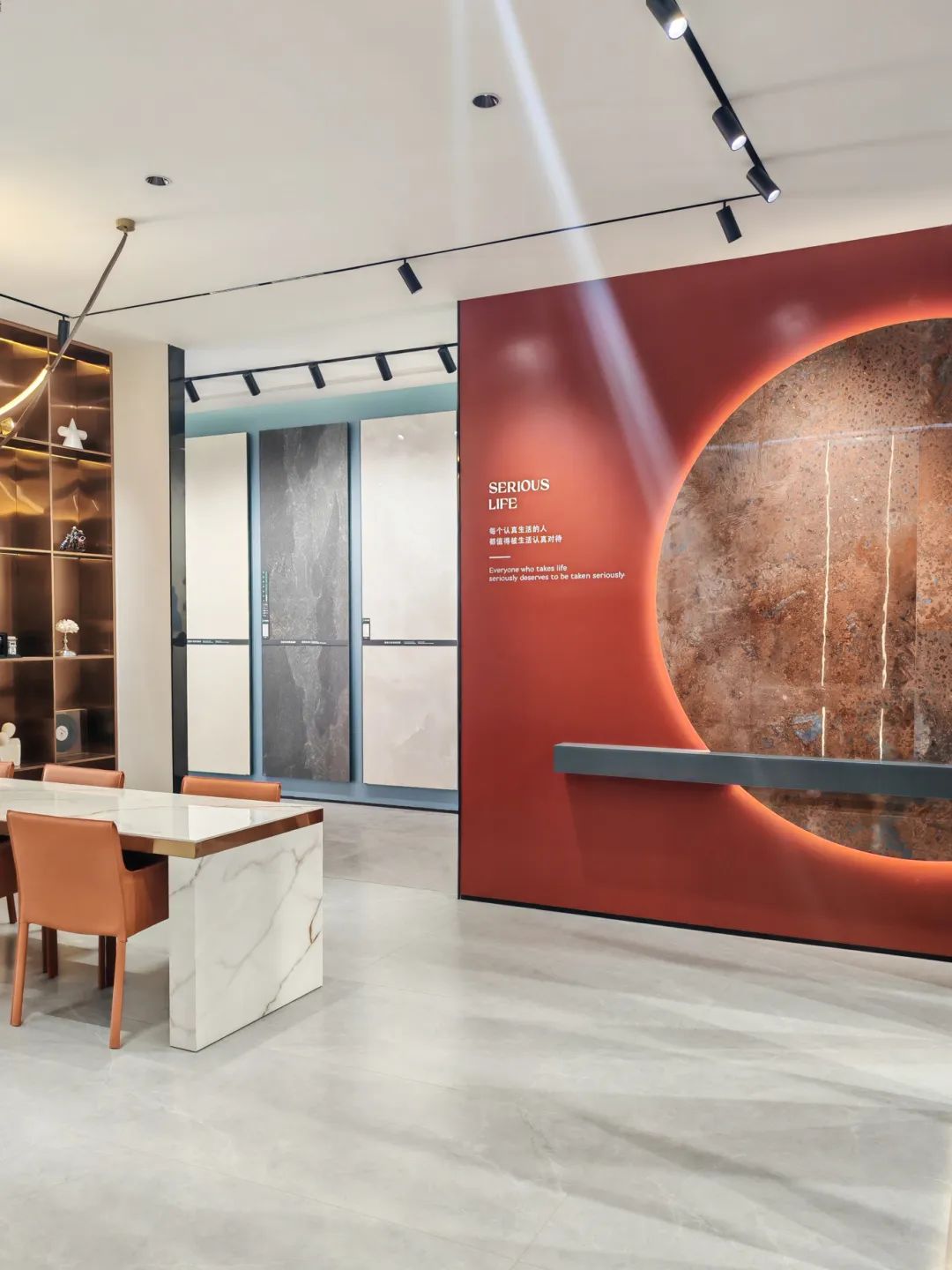 墙上展示的瓷砖产品仿佛一件件艺术品,在柔和的灯光照射下,唤醒观者对触感、纹理、色感的细腻感知。